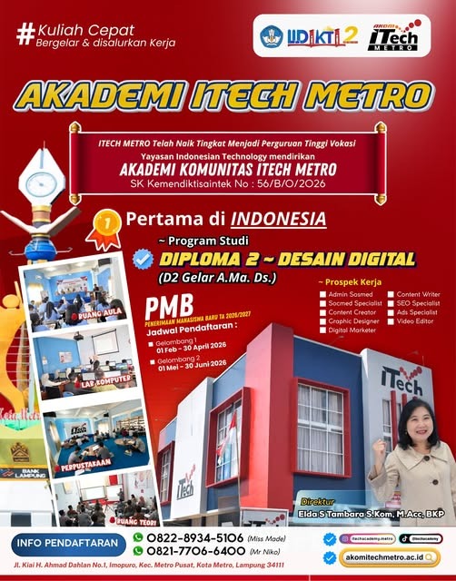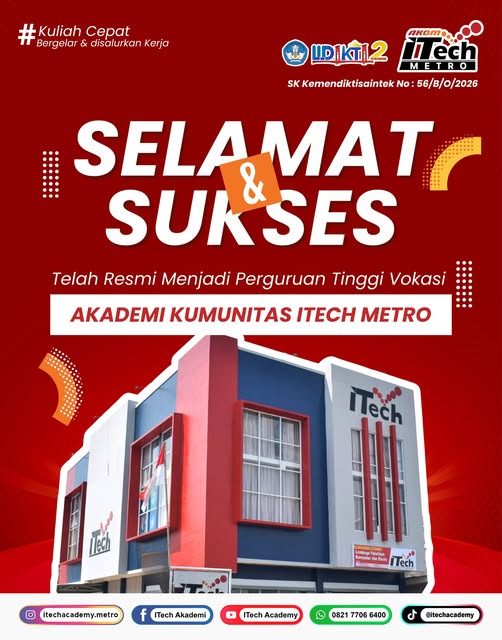 SELAMAT & SUKSES!Akademi Komunitas ITech Metro kini resmi menjadi Perguruan Tinggi Vokasi 🎓✨Langkah besar ini…